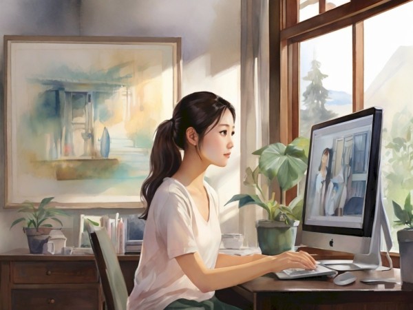 4. '모니터링 업무를 하는 동양인 여성이 컴퓨터 모니터를 보고 있습니다. 공간은 가정집이며, 복장은 캐쥬얼입니다. 컴퓨터 모니터는 인공지능 시대와 가능성을 의미합니다. 그림은 수채화 느낌입니다.' (레오나르도ai)