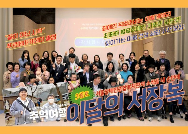 이번 3월호에서는 푸르메아카데미 졸업생들의 새로운 시작을 다룬 "졸업" 이야기부터 서울형 장애인 개인예산제 모의 적용 사업에 참여한 이들의 진솔한 인터뷰, 청년 중장년 직업 준비 프로그램 소개 영상, 복지관에서 진행되는 다양한 프로그램 모집 안내"까지 만나볼 수 있습니다.