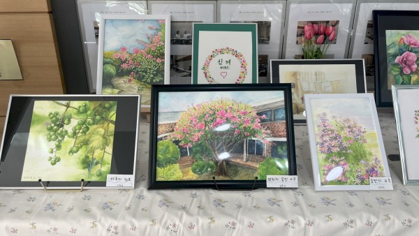 <<정원의 꽃 오후>>라는 작품은 복지관 중앙정원에 핀 꽃나무를 섬세하게 그려낸 작품입니다.