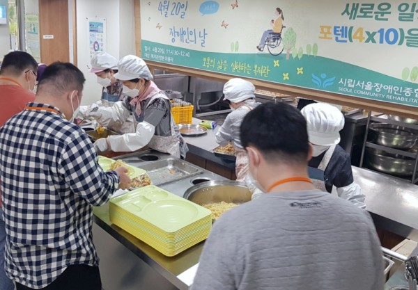 장애인의 날 특식 및 뽑기 이벤트 진행했습니다! 페이지 정보 작성자 서울장애인복지관 작성일22-04-21 18:18 조회수695 본문 자세히 보기 장애인의 날을 맞아 복지관 식당에서 특식을 제공하고, 뽑기 이벤트를 진행하여 즐거움을 더했습니다.특별히 셰프를 초청하여 만든 캘리포니아롤, 식당 자원봉사자들이 정성스럽게 만든 또띠아 스파게티, 단호박 샐러드 등 평소 이용자들이 자주 접하기 어려운 메뉴로 식단을 구성하여 식당 이용의 즐거움을 높였습니다.또한, 소소한 선물을 준비하여 뽑기 이벤트를 통해 이용자들과 즐겁게 소통하는 시간을 갖고 감사의 마음도 전했습니다. 자세히 보기 자세히 보기 목록 답변 이전글 장애인 건강보건관리 우수 수행기관으로 ‘보건복지부장관 표창’ 수상 22.04.25 다음글 장애 당사자의 이웃으로, 친구로 함께할 시민옹호활동가의 동행길을 응원합니다. 22.04.21