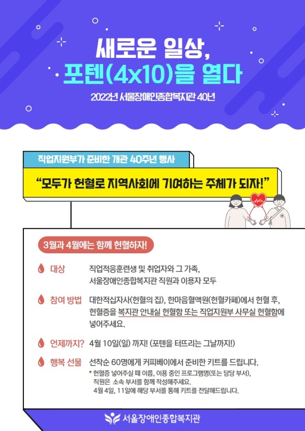 직업지원부는 직업적응훈련생과 취업자, 그 가족, 그 밖의 모든 복지관 이용자와 직원들이 참여할 수 있는 헌혈 캠페인을 비롯하여 4월 10일(일)에는 직업적응훈련생과 취업자를 위한 ‘홈커밍데이’ 행사도 계획하고 있습니다.