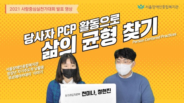 서울장애인종합복지관은 ‘사람중심’ 실천 전략을 중심으로 사회복지, 상담, 물리치료, 직업재활 등 복지관 속 다영역 직원들이 참여한 PCP 실천위원회를 구성하고 있습니다. PCP 실천위원회는 장애인이 자신의 필요에 대해 더 많은 목소리를 내고, 그 소리에 응답하여 복지관의 서비스가 더 나은 방향으로 정비할 수 있도록 지원합니다. 서울장애인종합복지관은 복지관을 넘어 지역사회 장애인의 의미 있는 삶을 위한 실천을 하겠습니다.
