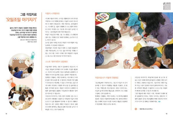 솜씨나 재주가 세밀하고 꼼꼼한 모양을 뜻하는 ‘오밀조밀’과 여러 가지가 어울려 예쁜 모양을 뜻하는 순우리말 ‘아기자기’가 합쳐진 ‘오밀조밀 아기자기’는 세 명의 아동이 참여하는 그룹 작업치료 프로그램명입니다.