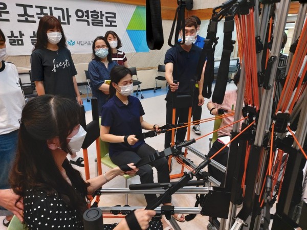 복지관 직원들 '장애인 커뮤니티 운동기구 지원사업' 관련 바디스파이더 교육