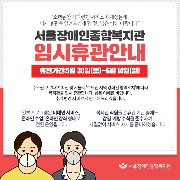 수도권 코로나19 확산 및 서울시 '수도권 지역 강화된 방역조치'에 따라 복지관을 임시 휴관합니다.