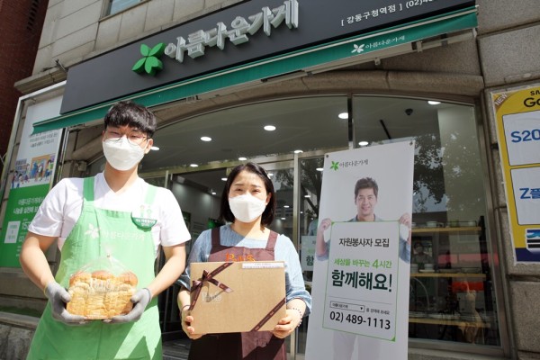 하루 동안, 아름다운가게 강동구청역점의 한 공간을 갓 만든 따뜻한 빵과 쿠키가 진열되어 오가는 사람들의 시선을 끌었습니다.