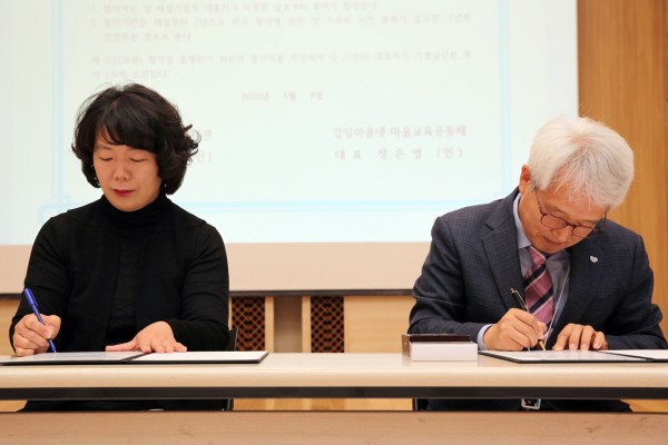 사업에 대한 동기 및 의미부여를 높이기 위한 설명회 이후 우리 복지관 곽재복 관장과 강일마을넷 마을공동체 정은영 대표가 협약서를 교환했습니다.