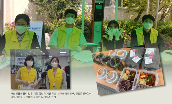 (사진_서울시 재난긴급생활비 업무 지원 중인 복지관 직원(능력향상촉진부, 건강증진부)과 공유자원부 직원들이 준비한 도시락과 편지