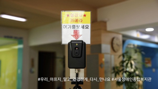 많은 사람이 오가는 복지관 정문 출입구와 로비입니다. 복지관 직원을 만나고, 사람과 담소를 나누는 모습이 가득했던 공간이 지금은 코로나19 예방 현수막, 열감지 카메라가 먼저 맞이를 합니다.
