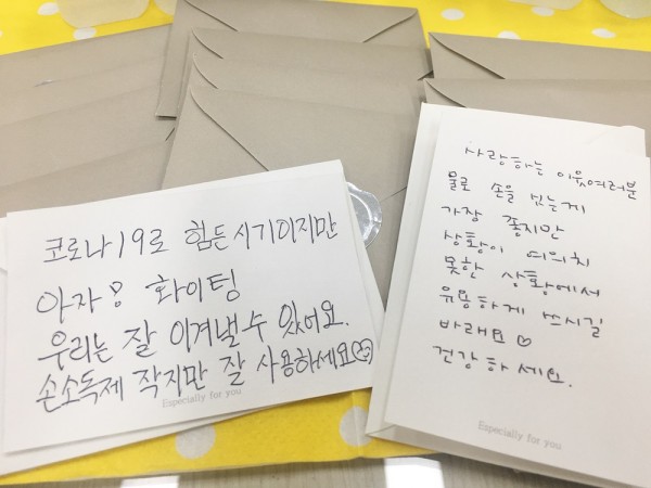 4개의 손소독제 중 복지관에 하나씩, 이렇게 많은 분들이 복지관에 손소독제와 엽서를 보내주셨습니다.