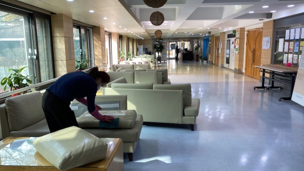 (사진1-서울장애인종합복지관 로비 소파를 소독 청소하는 모습)