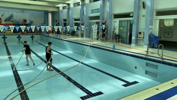 (사진2_수중재활센터 풀장 물을 모두 빼고 소독, 청소하는 건강증진부 직원들)