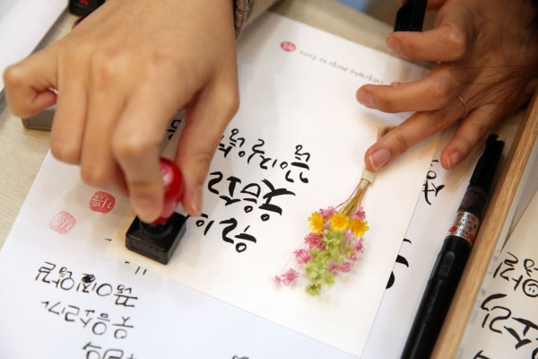 사진2. 김여종 캘리그라피 강사가 진행한 수업. 붓펜을 사용하는 방법부터 예쁜 글씨체를 배우고 연습하는 시간.