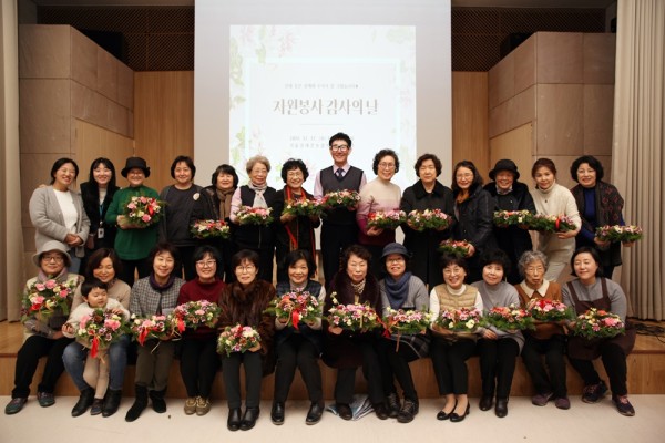 우리복지관에서 이미 자원활동으로 관계가 깊은 라문주 강사의 설명에 따라, 꽃과 풀을 하나씩 꽂아보았습니다.