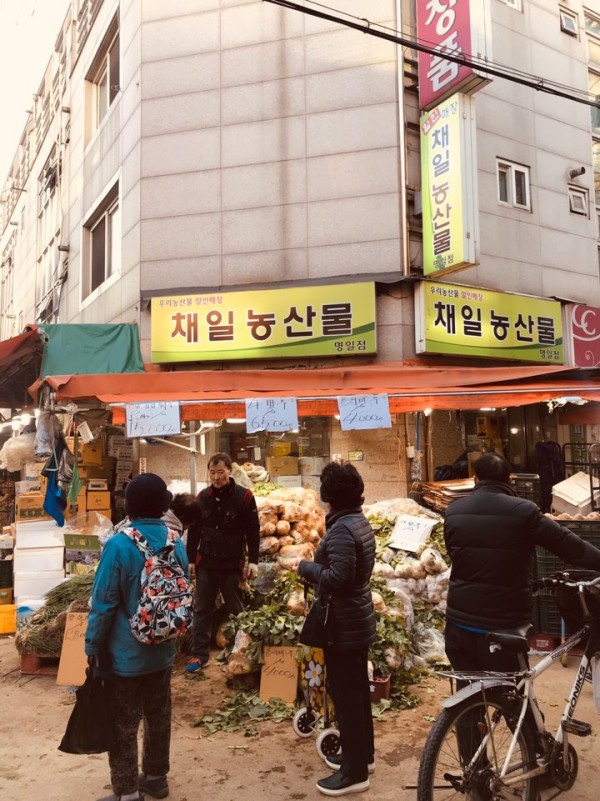 가게 앞에서 사진을 찍는 것에 쑥스러우신 것 같아 가게 사진만 찍었습니다. '채일농산물'은 명일 전통시장 입구에 있습니다.