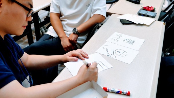 사진_의사소통카드에 관해 서로 이야기하며 제작해 보는 모습